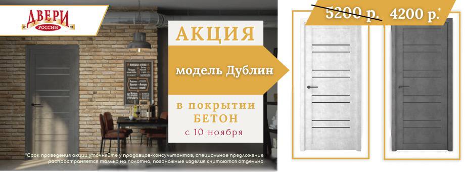 В акции участвует дверное полотно «Дублин» в цвете Темный бетон с графитовым стеклом и Светлый бетон с графитовым стеклом из коллекции "Лофт".